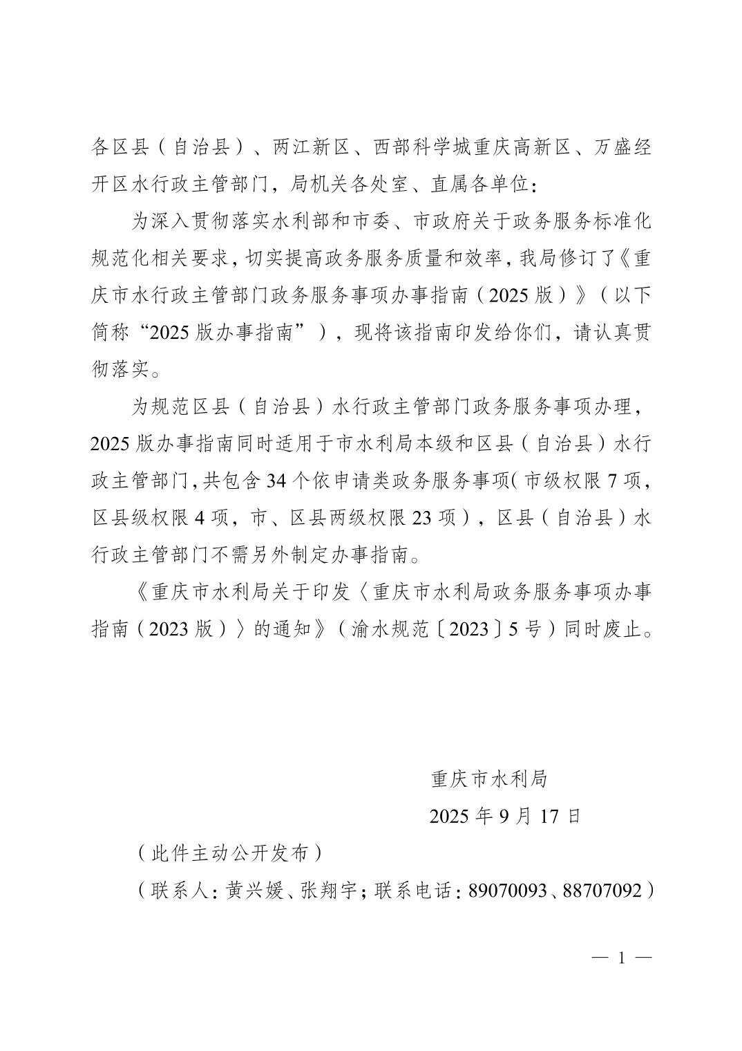 重庆市水利局关于印发《重庆市水行政主管部门政务服务事项办事指南(2025版)》的通知